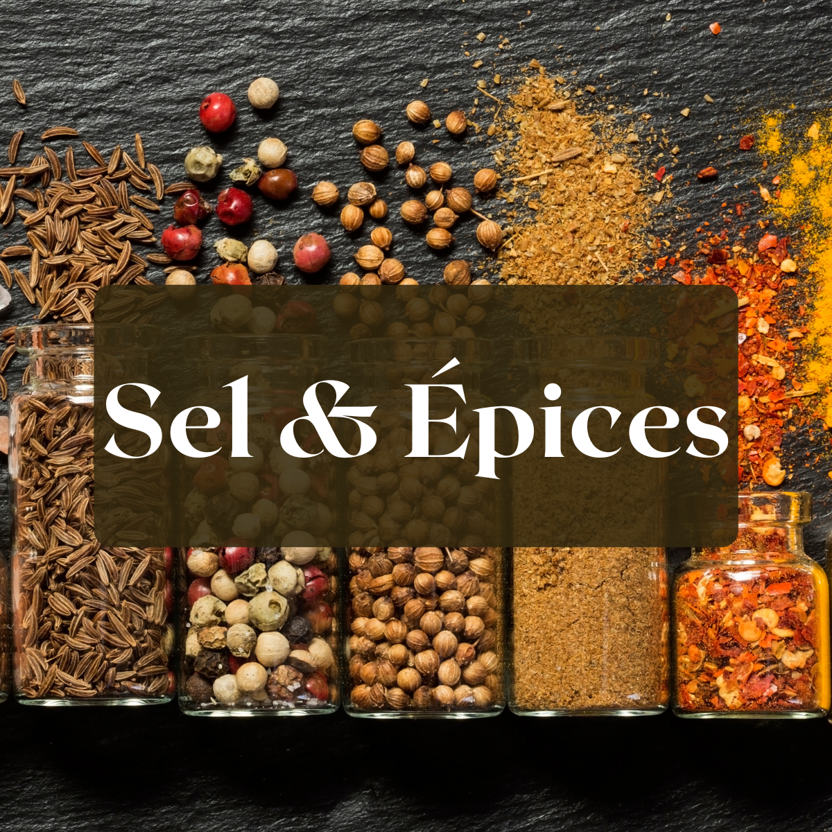 Sel fin, gros sel, sel fou, sel parfumé, poivre, épices, herbes séchées.